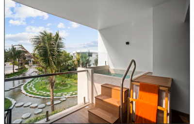 Diện tích khoảng 392 m2, hướng vườn. Biệt thự gồm phòng khách, bếp, 02 phòng ngủ 01 giường đôi, 01 phòng ngủ 02 giường đơn, hồ bơi riêng ngoài trời có độ sâu khoảng 1.2 m, 02 bồn jacuzzi lộ thiên ngoài ban công, 03 phòng tắm có buồng tắm đứng vòi hoa sen và bồn tắm nằm.