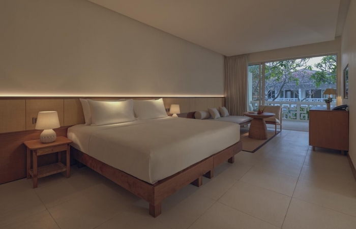- Phòng Deluxe Suite: Phòng có diện tích khoảng 65m2, với tầm nhìn hướng vườn. Phòng được bố trí 01 giường đôi lớn hoặc 2 giường đơn. Phòng dành cho tối đa 3 khách (2 người lớn và 1 trẻ em). Phòng tắm có buồng tắm đứng vòi sen và bồn tắm nằm.
