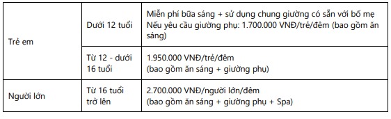 | Biệt thự hướng biển có hồ bơi riêng (Ocean View Pool Villa) | 2 người lớn + 2 trẻ em dưới 12 tuổi | 3 người lớn + 1 trẻ em dưới 12 tuổi | |
