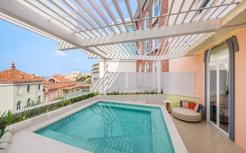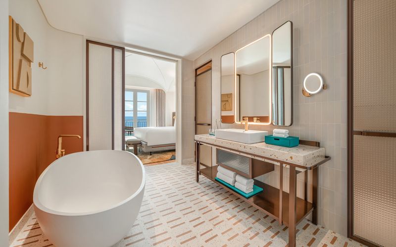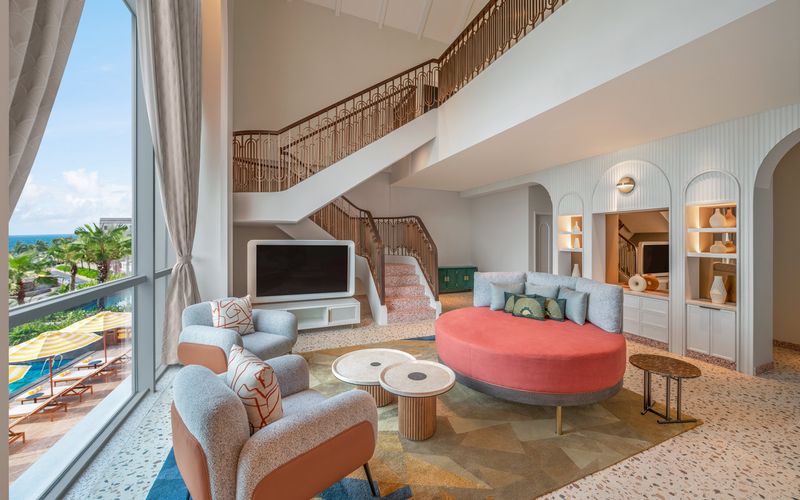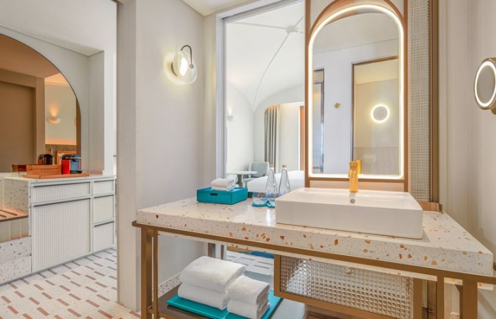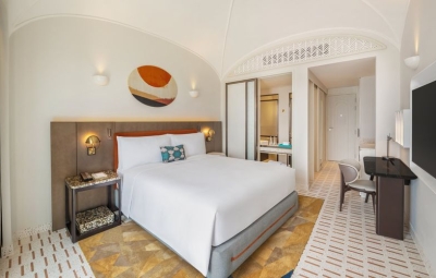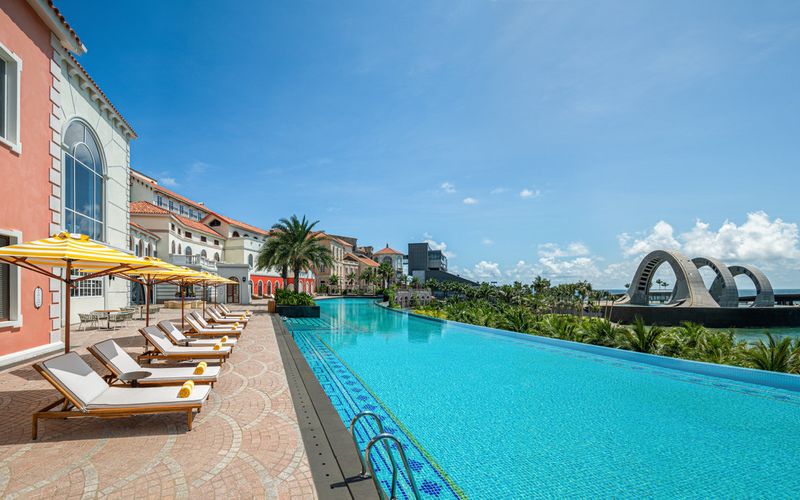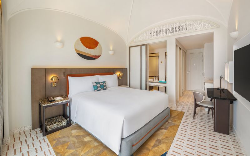 Với 197 gian phòng được thiết kế độc đáo theo phong cách Địa Trung Hải, khách sạn tái hiện vẻ đẹp sống động của các thị trấn ven biển nước Ý. Hơi thở của văn hóa và nghệ thuật được tiếp cận từ nội thất tinh chọn, phối cùng bảng màu đặc trưng được sắp đặt có chủ đích tạo nên vẻ đẹp thị giác ấn tượng, hướng đến biểu tượng Cầu Hôn trên nền đại dương xanh thẳm.