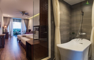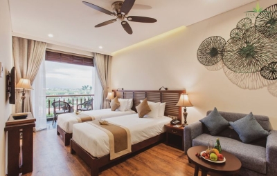 Tất cả các hạng villas, suites và phòng của resort mang sự pha trộn hài hòa giữa kiến trúc Á và Âu trong từng đường nét thiết kế. Mỗi phòng đều có hướng nhìn ra hồ bơi ozon vô cực, khu vườn xanh mát và dòng sông Cổ Cò đẹp như tranh vẽ.