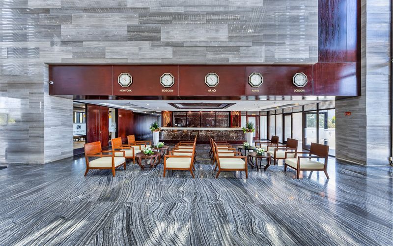 - Conference 2: Sức chứa 110 khách kèm dịch vụ: Làm backdrop ( Cao 3.65m, Ngang 05m) và Cho thuê Bộ phiên dịch không dây + Bốt phiên dịch.